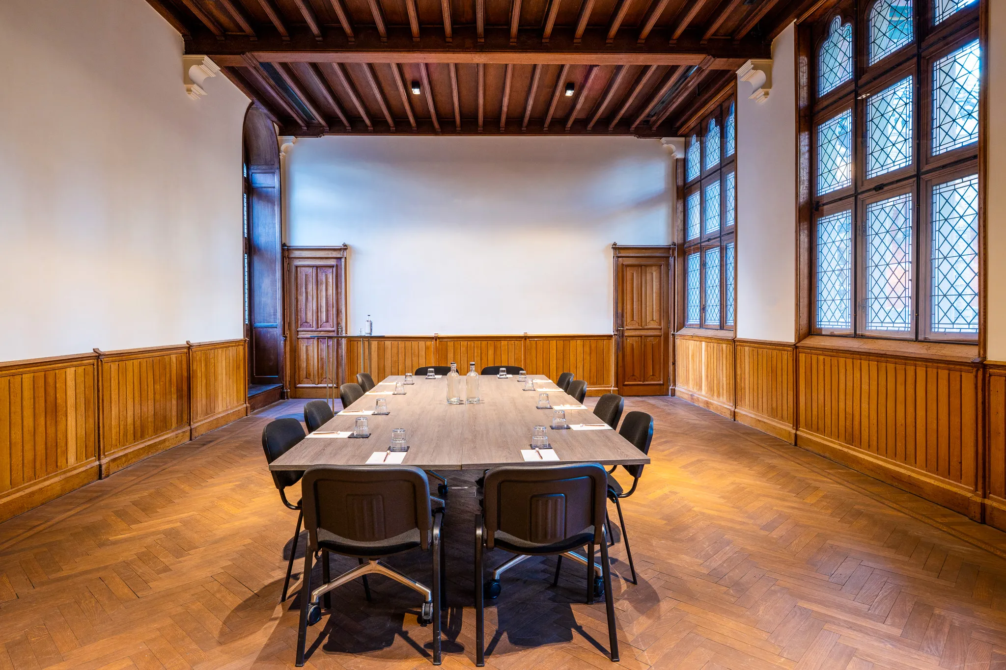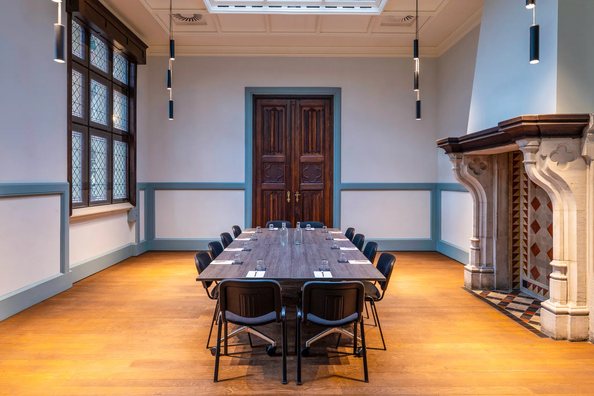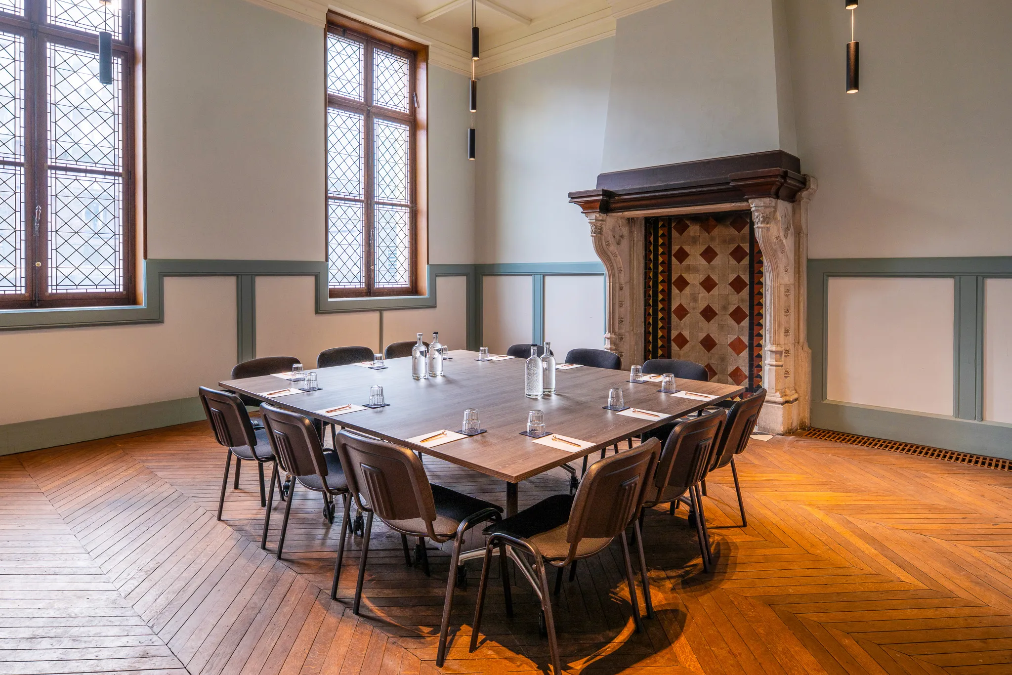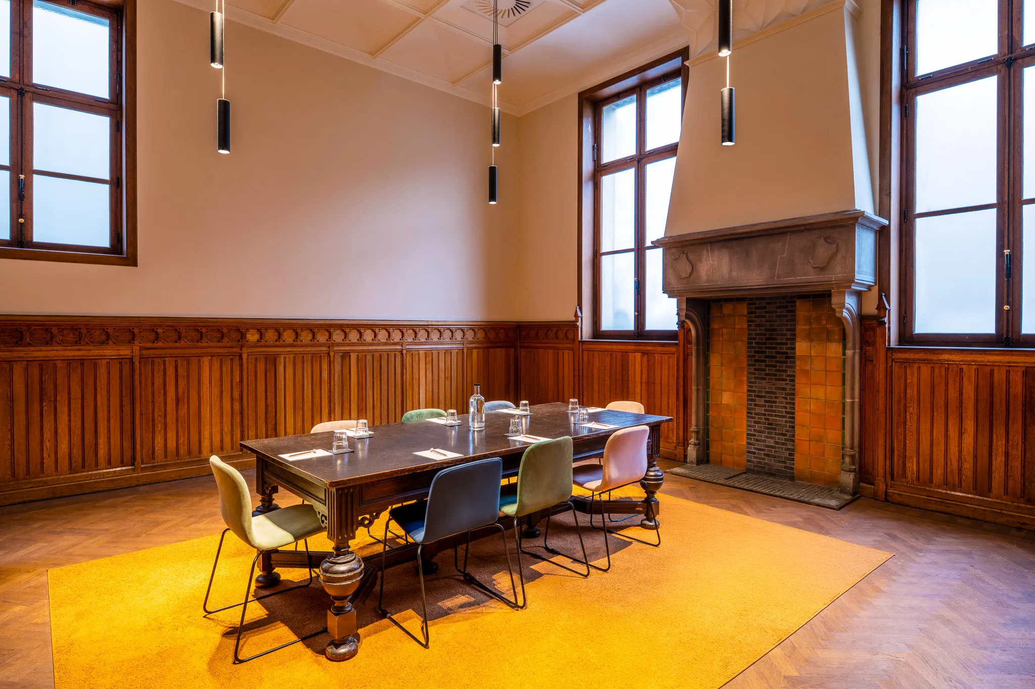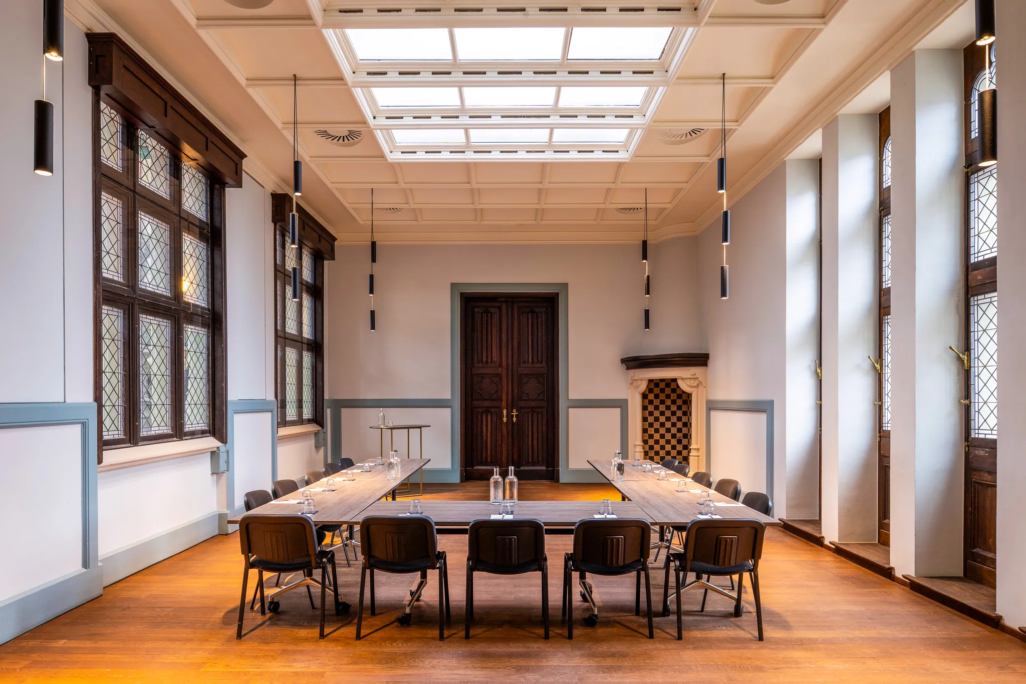 Een vergaderruimte met karakter, ontworpen voor helderheid, discretie en concentratie. De ingetogen sfeer en historische details maken het de ideale plek voor strategische gesprekken in klein gezelschap.